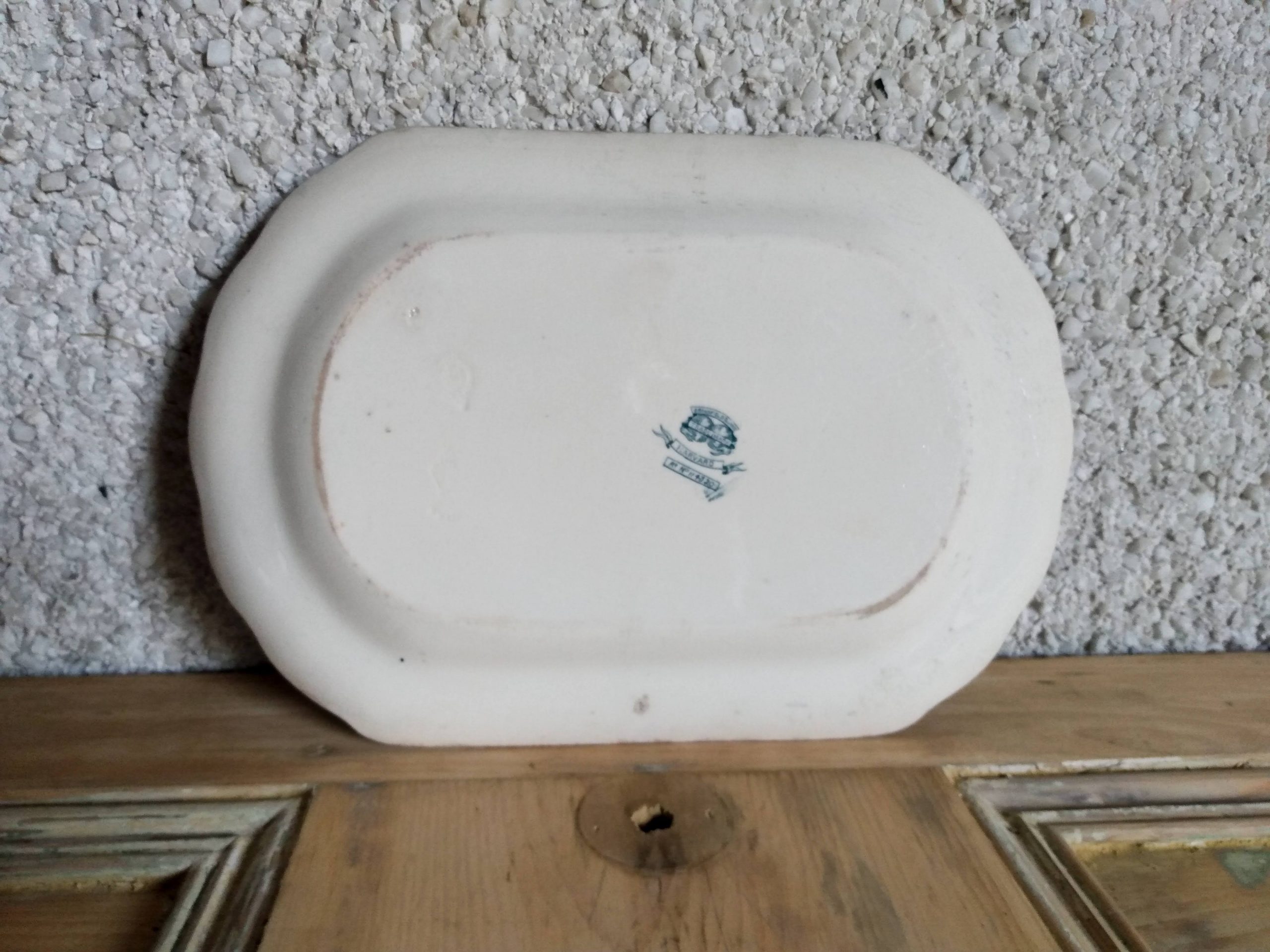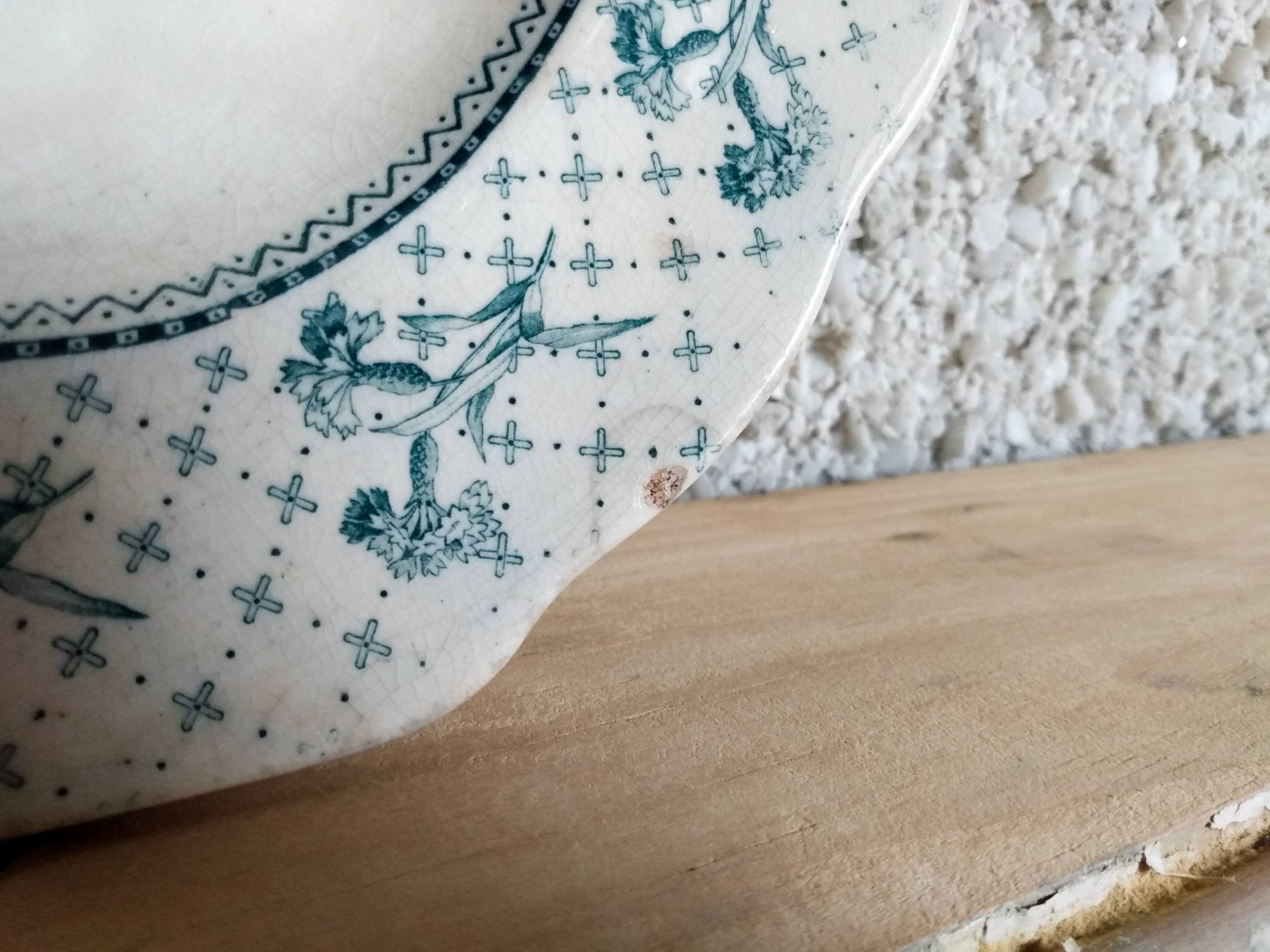 An antique Brownfield & Sons porcelain platter with the blue Harvard pattern. Made in England and estimated to be from around 1880’s. Due to old age it has some discoloring, fading of the pattern, and one major chip (see picture).