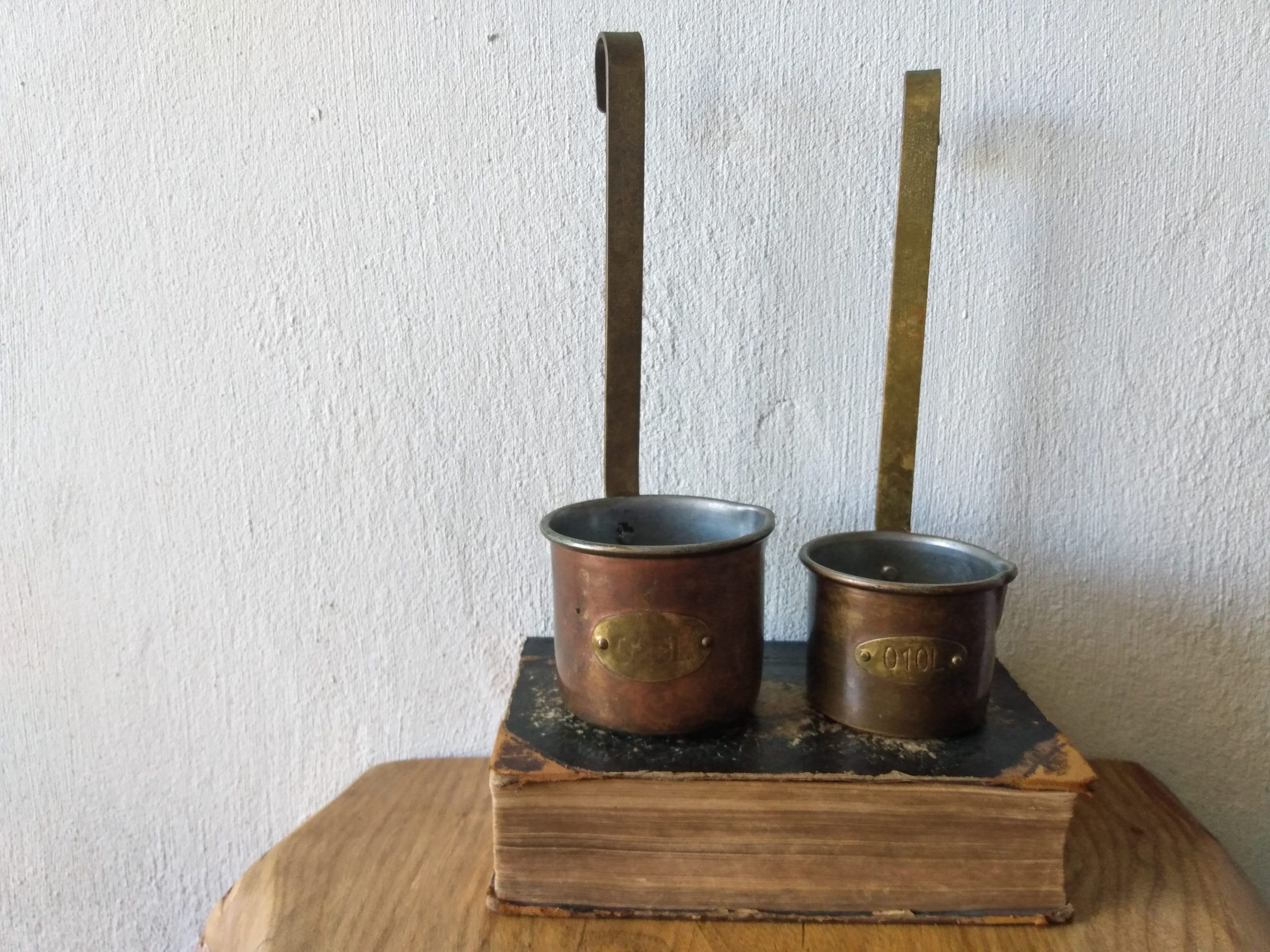 A set of two vintage copper milk ladles with brass handles. The smaller one has a label with 0,10 l (Height: 5 cm/2 inch, Width: 7 cm/2,75 inch) on it and the bigger one has a label with 0,25 l (Height: 6,5 cm/2,5 inch , Width: 8 cm/3 inch) on it.