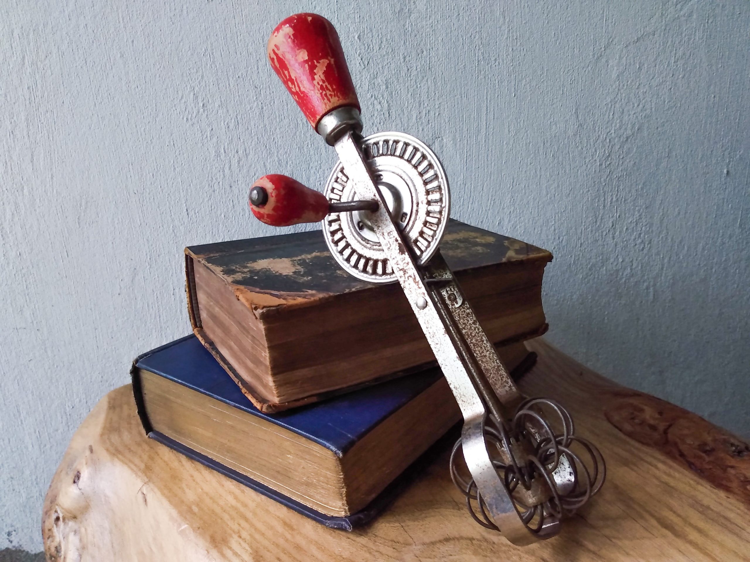 Vintage wooden handled rotary egg beater with springs. The wooden handles have red paint on them. Length: 27 cm/10.5 inch.